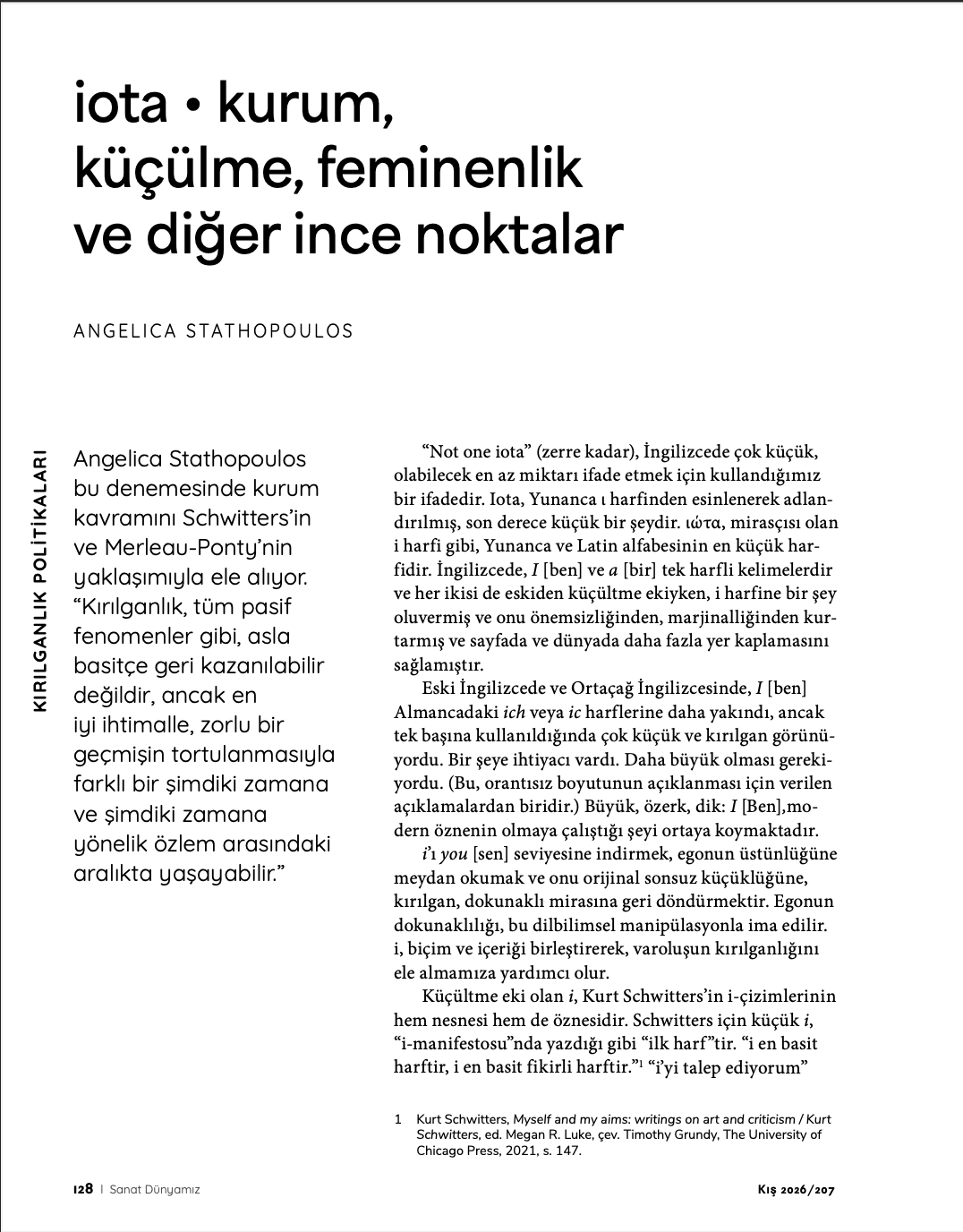 “iota • kurum, küçülme, feminenlik ve diğer ince noktalar” / “iota • institution, diminution, femininity, and other fine points” --- New essay in Sanat Dünyamiz, Turkish translation by Alâra Kuset.