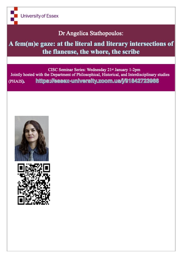 On Wednesday the 21st of January, Angelica is giving an online talk entitled “A fem(m)e gaze: at the literal and literary intersections of the flaneuse, the whore, the scribe”, hosted by the Centre for Intimate and Sexual Citizenship (CISC) at the University of Essex.